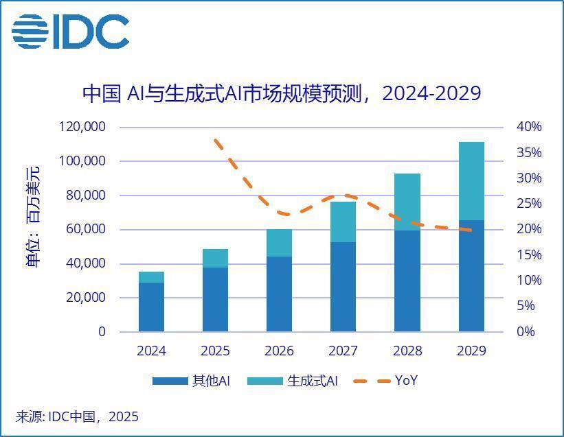 IDC数据显示,2024年中国生成式AI占AI市场投资总规模的18.2%。随着生成式AI技术的快速发展,2029年生成式AI投资占比将达到41.1%,投资规模超450亿美元,五年复合增长率为48.0%。IDC认为,生成式AI正持续深化其在多个垂直领域的应用价值,推动行业自动化与智能化进程迈向新阶段。企业员工可借助生成式AI实时生成结构化业务洞察、自动完成多模态工作报告合成,提升战略决策效率;开发人员能够利用其实现智能代码重构、系统架构辅助设计、自动化漏洞修复,提升研发效能与软件可靠性;在工业、医疗、金融等垂直领域,生成式AI已可协助生成高精度设计仿真方案、辅助临床诊断推理、自动化生成合规风控报告,驱动行业创新与经济效益提升。